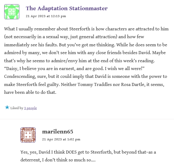 With this week’s reading, we see a dark side or at least a possible dark side to the Micawbers as they take advantage of Traddles. (Like Steerforth takes advantage of David?) This begins Mr. Micawber’s surprising character arc, though you could argue it’s not so much that he changes as that we see him in many different lights.