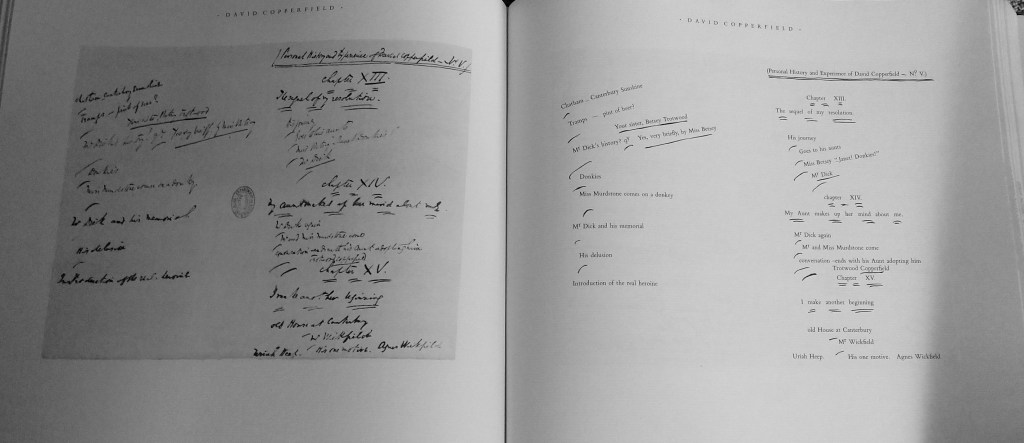 One of the books I’ve been most eager to devour is Harry Stone’s Dickens’ Working Notes for His Novels, and I just found it in the oversize section of the university library, its pages filled with facsimiles of Dickens’s manuscript pages and working notes, with typed versions side-by-side for ease in deciphering Dickens’s handwriting.