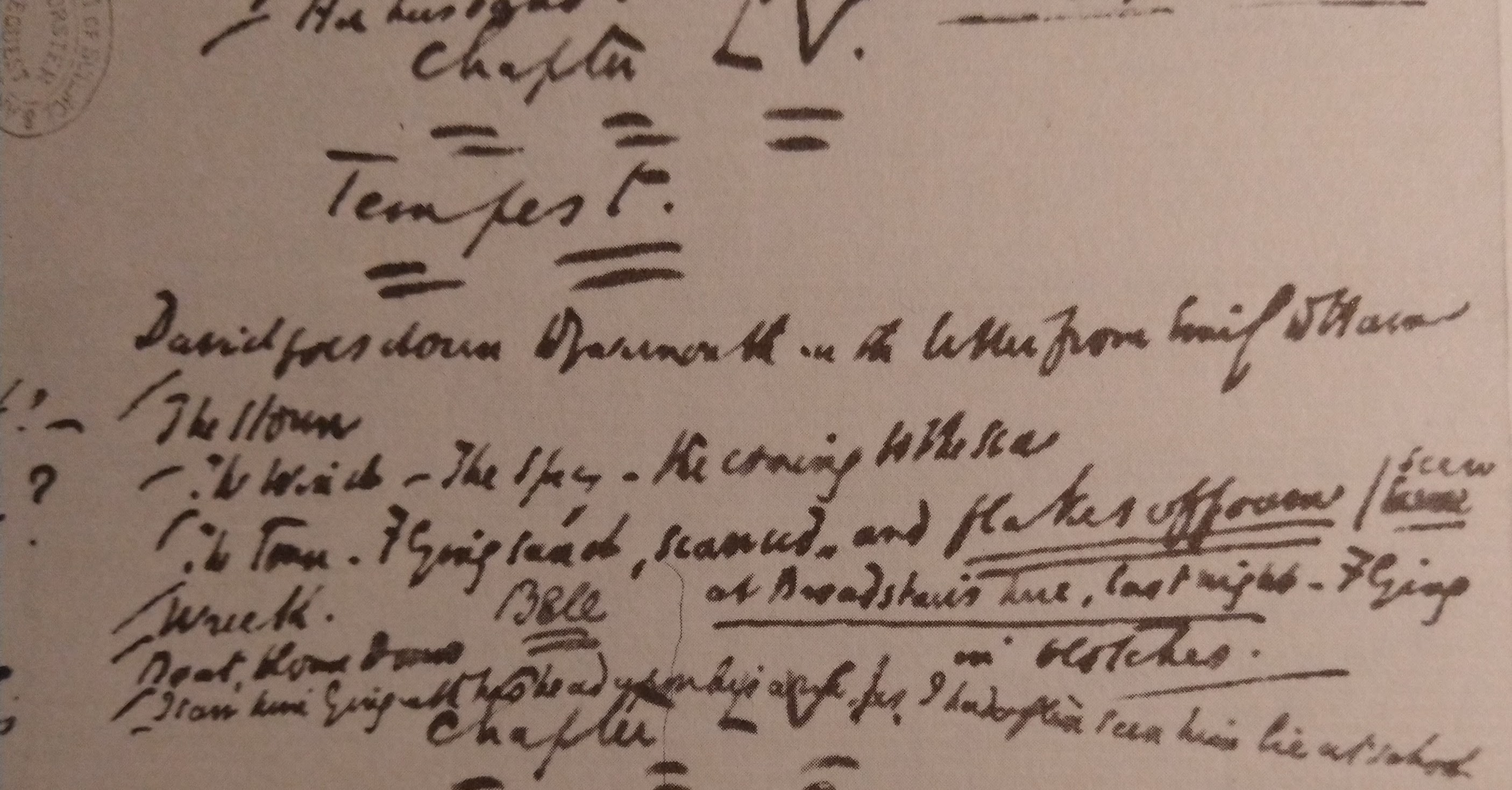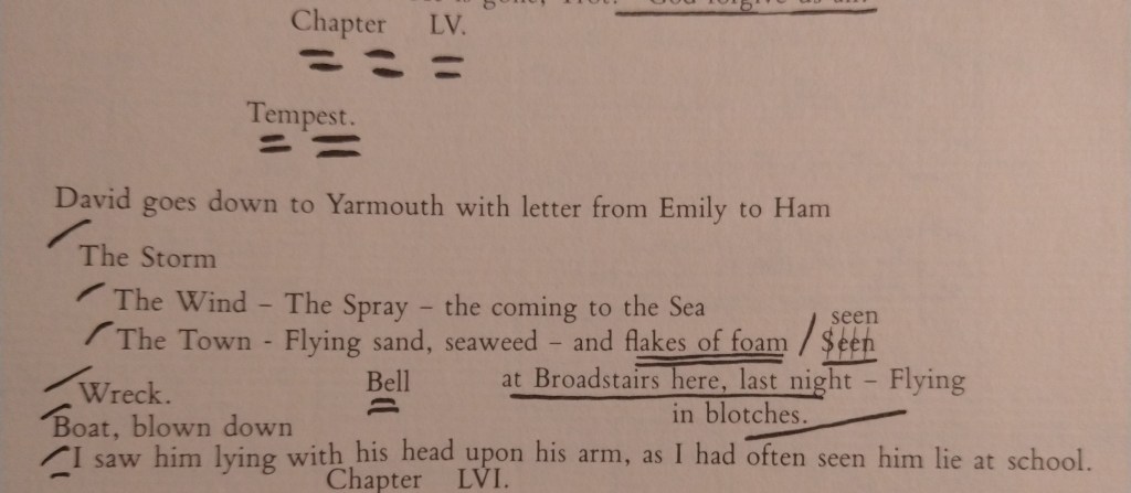 A “Dickens’s Writing Lab” post; an Excerpt from Harry Stone’s Dickens’ Working Notes for His Novels on the details of his “Tempest” chapter in David Copperfield; with brief commentary.