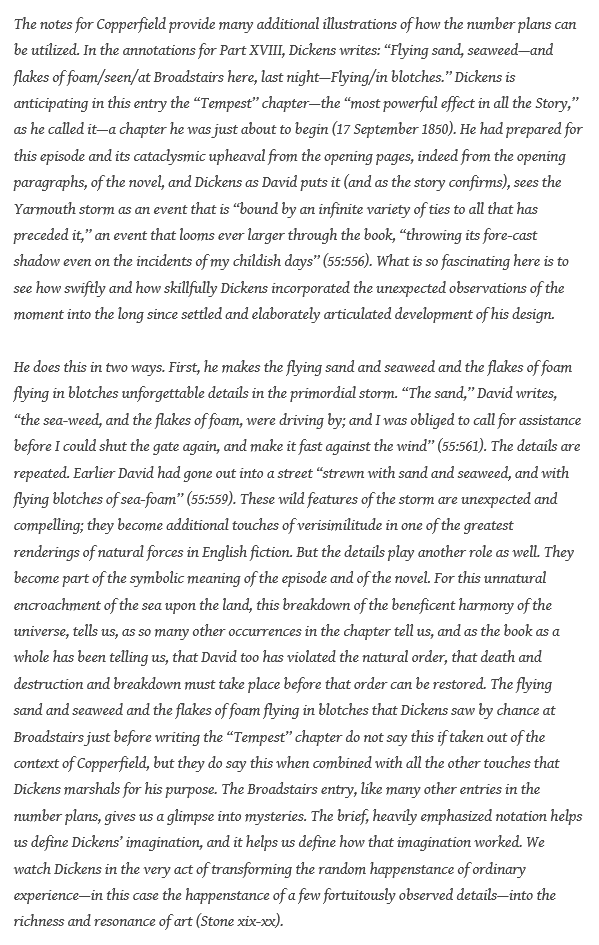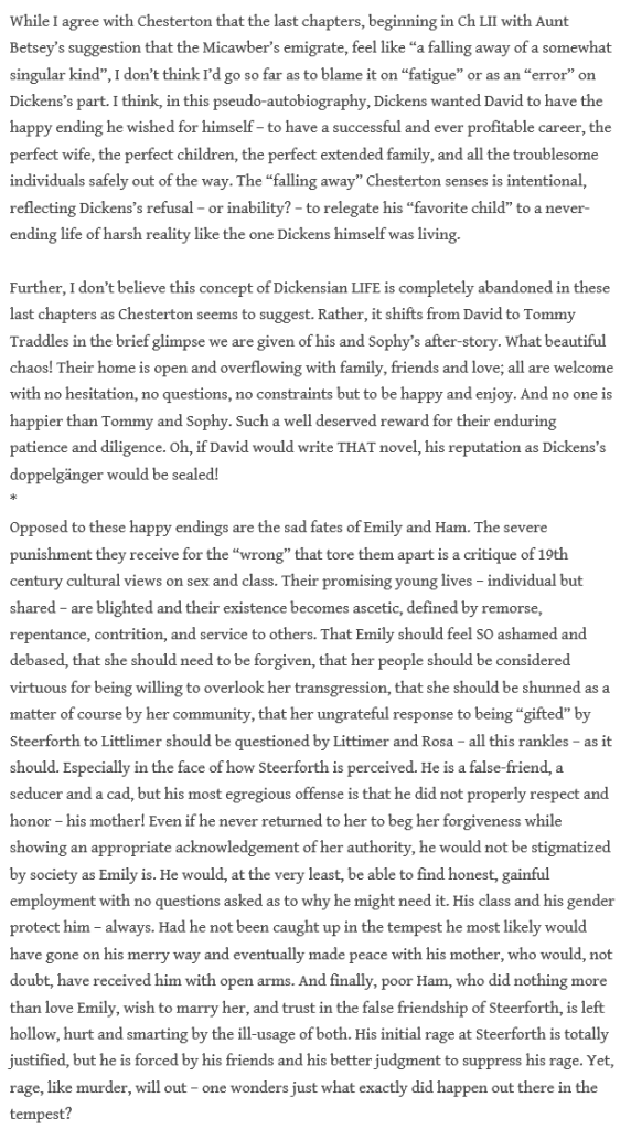 - Dickens’ “Writing Lab”: Characterization & Character Arcs; Sympathy for the Villain; Foreshadowing and Deja-Vu; Inaction in the Protagonist; “Writing from the Inside Out”; David Copperfield is Simply “About Life” (Lucy and Jeff discussed the power of the first-person narration; Lucy writes that DC is different because he is writing from the inside out; we’ve all discussed various aspects of the “writing lab” weekly. Chris on foreshadowing and the unique early-?- use of deja-vu; Chris and Stationmaster analyzing Dickens’s characterization, Chris often noting where there are echoes of Dickens’s former characters; Rob, Boze and I touching a lot on the descriptive powers of Dickens which are in full force in the “Tempest” chapter.)