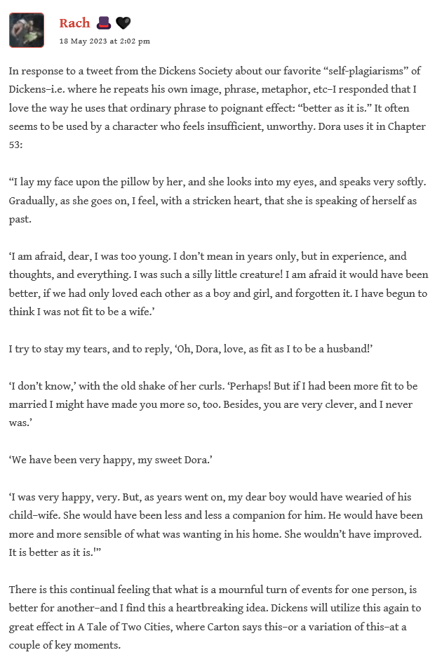 Perhaps that is something we want to discuss in the comments below, and/or at our next Zoom meething! Our Zoom meeting to discuss David Copperfield will take place on Saturday, 10 June! 11am PT/2pm ET/7pm GMT (London time). Please join us! If you’d like a link, please feel free to message Rach here on the site, or on twitter.