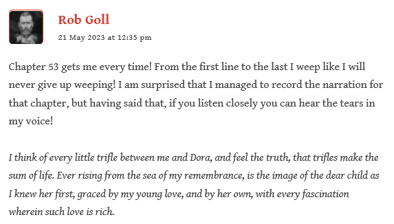 I have a strong attachment to Copperfield on account of having narrated this novel for a multi cast audiobook version which I also cast and edited. The characters for me have that added layer of reality in that I can hear their voices (as performed by my cast of 15 narrators) – indeed the events of the novel have an ‘echo of reality’ in my memory as if I were actually present in those scenes – it is hard to tell David’s story and not remember what he remembers so vividly; not to feel what he feels so deeply. (Perhaps my bias is further coloured by the fact of my having played Daniel Peggotty too!) First person narratives are great to get to grips with, so I ought to confess that I have a similar strong attachment to Pip>