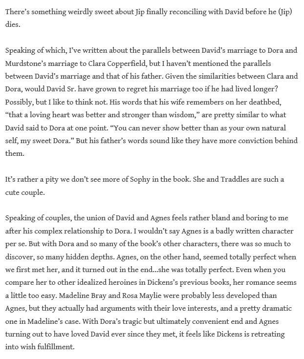 Stationmaster discusses some poignant things about our characters here at the end–not forgetting our dear Jip at the last. He also discusses some of the issues alluded to at the beginning, as to whether we will be satisfied by the David-Agnes relationship, which he finds “bland”: