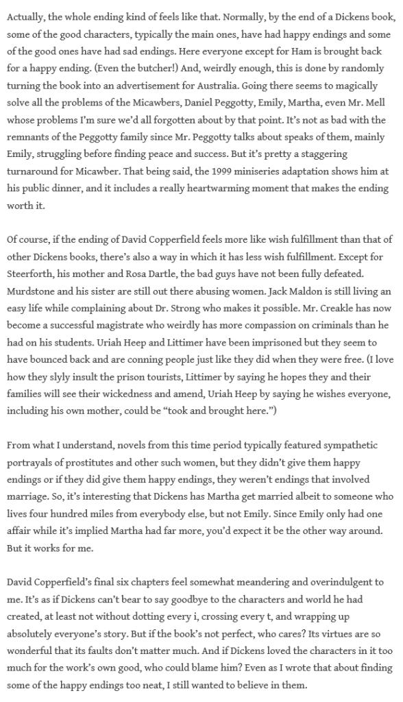 Does Dickens dispense with our problematic characters (e.g. the Micawbers, Emily, Martha) too easily? Is it merely “wish fulfillment”? He finds the final chapters a little too “meandering,” yet the book’s “virtues are so wonderful that its faults don’t matter much”: