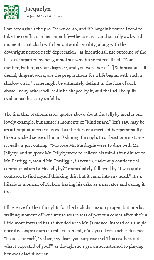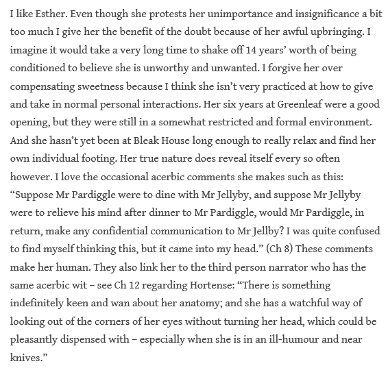 In another comment, the Stationmaster compares Esther to Agnes Wickfield: