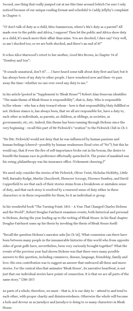 “I think it is part of Dickens’s plan to expose the muddle of the question(s) of who is responsible, how far does it go, how is it shared, when is it best left alone, where is the line between individual responsibility – societal responsibility – state responsibility, IS there a line? He’s making us think, and if that thinking changes how we behave, even if only toward ourselves though hopefully toward others as well, then ‘Bleak House’ is a success!”