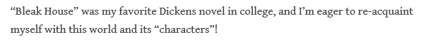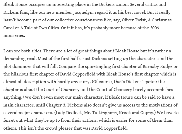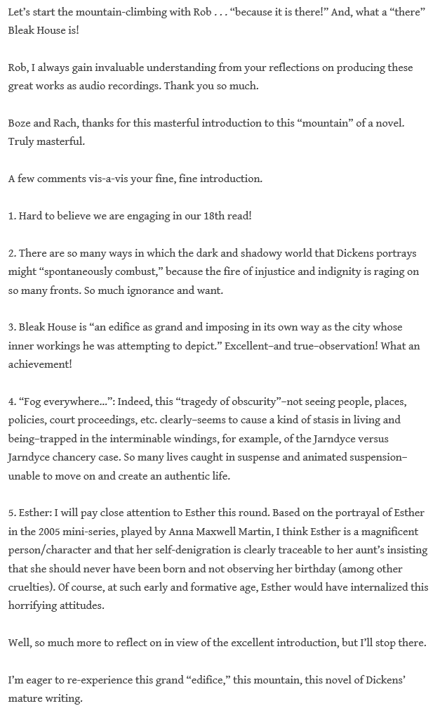 Huge “thank you” to the appreciative comments about the Introduction to Bleak House, friends! Daniel, Rob, Lenny shared a number of insights about its helpfulness. Lenny wrote: