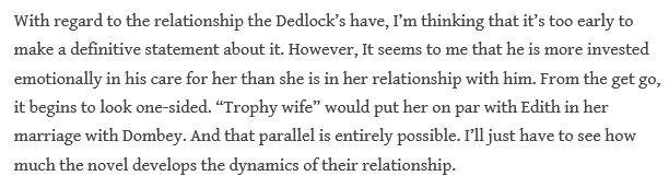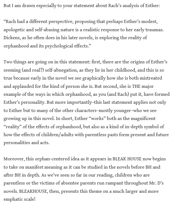 Man, the more I write about these various characters in BH, I realize how astute the psychological portraits ARE that Dickens has drawn up!