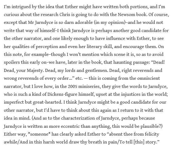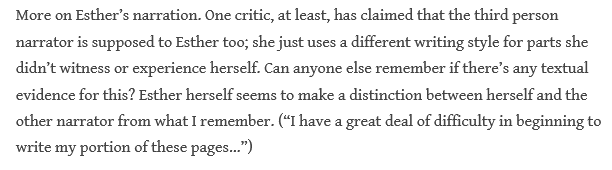 I am intrigued by the Esther-as-mystery-narrator, but think that, if the mystery narrator is someone we know, it is far likelier to be John Jarndyce: