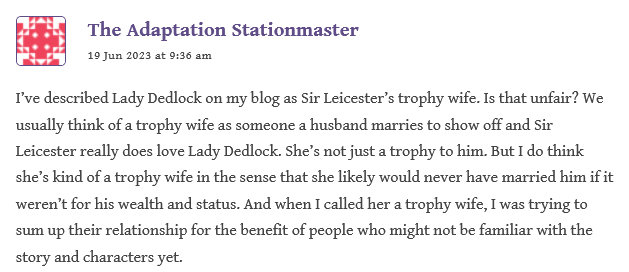 Stationmaster: The Guppy Lady Dedlock confrontations are always fraught with tension, it seems to me, because he is decidedly trying to ferret out from her–and also directly challenging her about– the truth regarding her resemblance to Esther and herself. He’s slowly but surely closing in on the secret of Esther’s birth and she (Lady Dedlock) is both desperately afraid of what he knows but haughtily angry that such a little twit of a law clerk should be on to her.