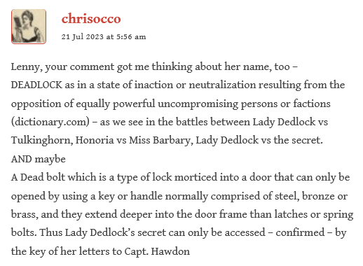 Lenny, after this comment, was really pondering that evocative name, “Dedlock”. Chris responds: