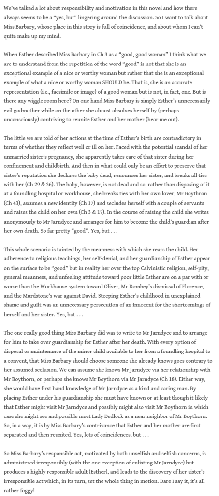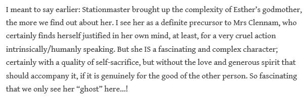 The Stationmaster brings up an interesting point: there is more mystery and complexity surrounding Esther’s godmother–Miss Barbary–than we initially think. However unthinkable her action and attitude, was it motivated by some semblance of nobility–at least in her own mind?