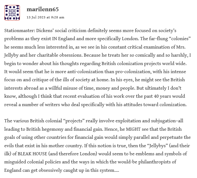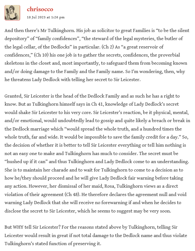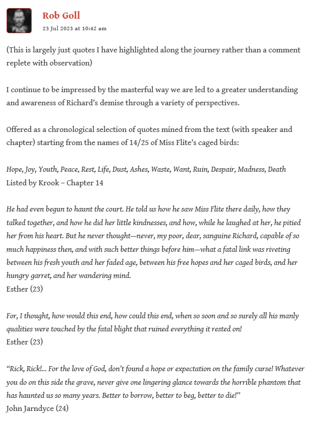 Dear Dickens Reading Club Members, especially Rob to whom this comment responds (to his 23 Jul 2023 at 2:56 pm reply in Weeks 3-4 section):