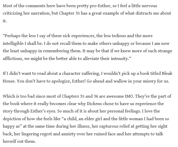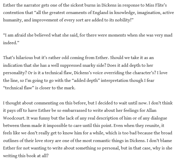 And the “sick burn” Esther got in: is this a sign of her barbed wit and insight, or a flaw in Dickens’s narration?