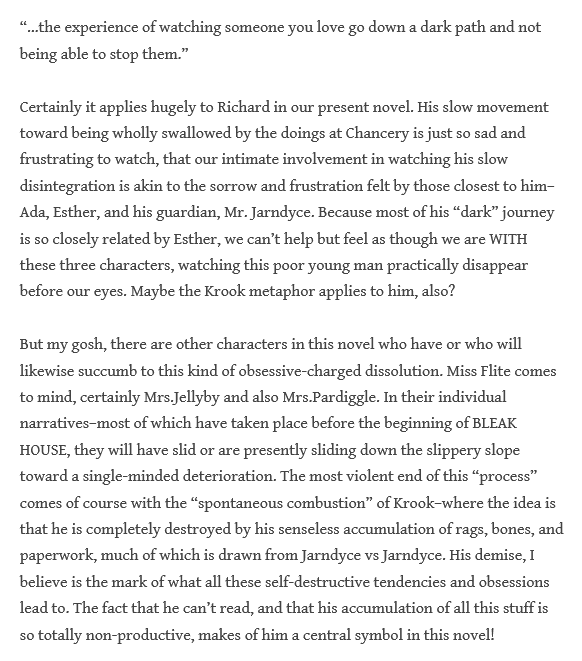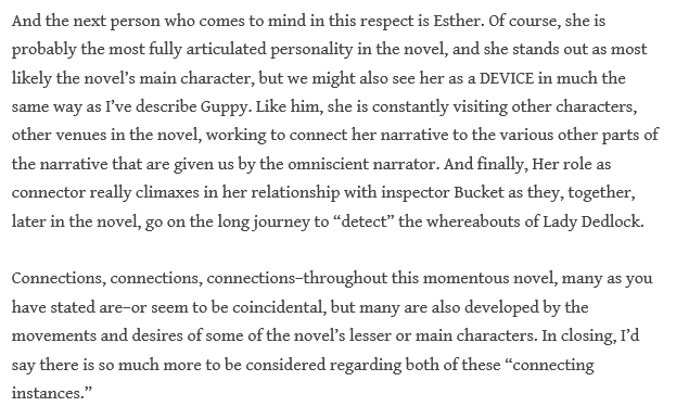 “In the reading that I give to it, Esther’s narrative is a marvelous ghost story. It is a narrative full of contradictory impulses, containing passages of brilliant, powerful, hallucinatory prose, equal to the best that any Victorian novelist (even Dickens!) could produce, but also replete with coy evasions, sentimental self-indulgence, and a studied, almost masochistic desire to hide her beauty, sexuality, and creativity from the view of others and from herself. To the extent that generations of readers have found her ‘unlikable’ as a narrator, she has succeeded in this effort at concealment. My task in reading her otherwise has been to bring out the darker, more powerful and conflicted side of Esther’s character and to locate the sources both of her strength and of her neuroses, the two being closely connected. Esther’s struggle to give voice to her inner conflicts and to report on her descent into dark, terrifying regions of her psyche is heroic and deserves more respect than critics have generally been willing to accord it. Esther is fully the equal in this regard of Jane Eyre, Lucy Snowe, or Catherine Ernshaw, and ‘Bleak House’ deserves recognition as one of the great achievements in the tradition of the female gothic.” (72-73)