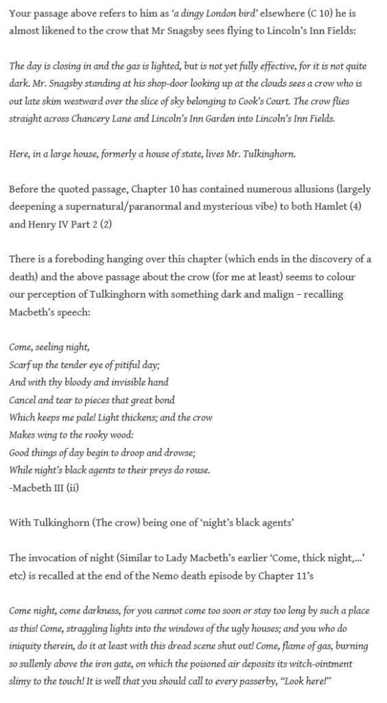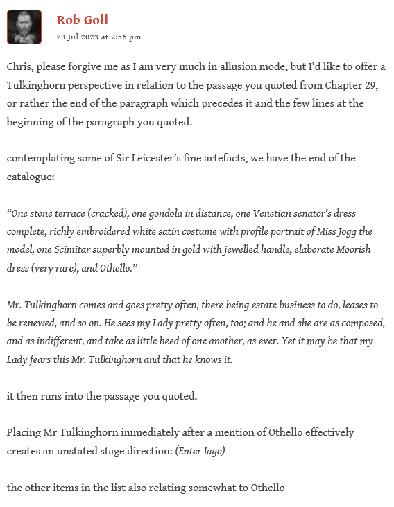 And Rob continues his marvelous analysis of literary influences on Tulkinghorn, with the many Othello/Iago connections: