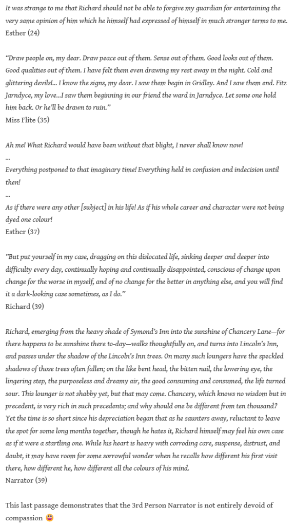 I wish I had included the following passage at the beginning of my list of quotes punctuating Richard’s deterioration, but perhaps mentioning it now it may be borne in mind as we accompany Richard and Ada towards our journey’s end.