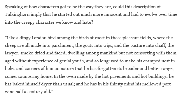 I never thought about the implications of something before. George used to be somewhat close to Sir Leicester Dedlock in a master-and-servant kind of way and Sir Leicester offered a reward for the capture of Tulkinghorn’s murderer. It must have been painful for him to know that Sir Leicester was partly responsible for his incarceration and not be able to talk to anyone about it.