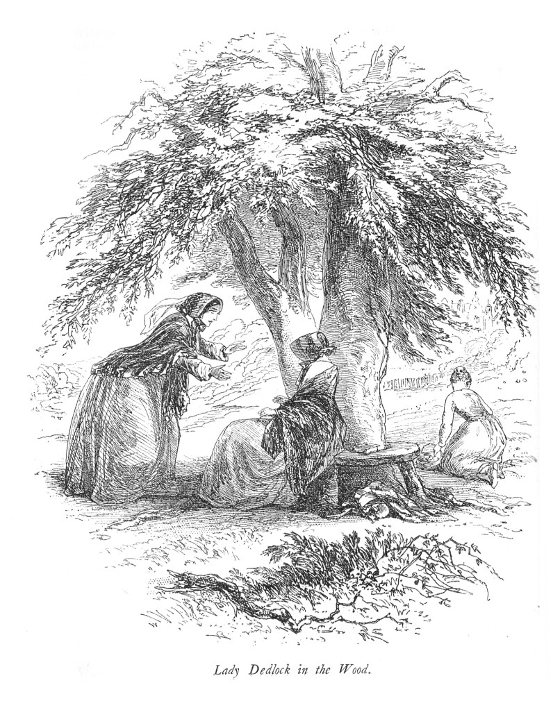 While walking on the grounds during her stay at Boythorn’s home in Lincolnshire, while anticipating a visit from Ada, Esther is approached by Lady Dedlock, who dismisses Charley in order to tell Esther the secret that must not be alluded to any longer: that she, Lady Dedlock, is her mother.