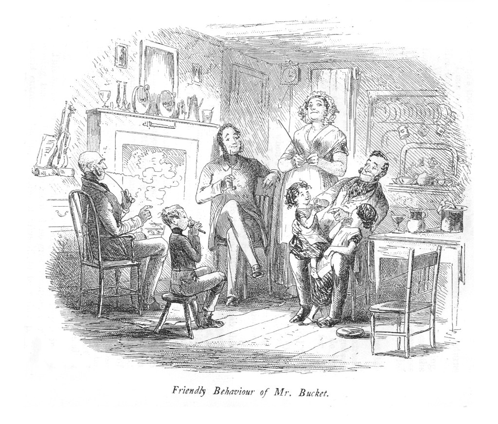 Inspector Bucket is the one of the most truly neutral characters in Dickens. On the one hand, he spends the first half of the book assisting Tulkinghorn, arrests George and is arguably responsible for the death of Jo. (He did put Jo in a hospital but there’s a reason Mr. Jarndyce didn’t just do that.) The description of him in Chapter 53 makes him sound like Tulkinghorn’s successor or reincarnation. “He makes for Sir Leicester Dedlock’s, which is at present a sort of home to him, where he comes and goes as he likes at all hours, where he is always welcome and made much of, where he knows the whole establishment, and walks in an atmosphere of mysterious greatness.” On the other hand, he brings Hortense to justice, leads the search for Lady Dedlock, gives Mrs. Snagsby some much needed marriage counseling and resolves Jarndyce and Jarndyce, humiliating Smallweed in the process. You might say he embodies the law in how he helps both the heroes and the villains, depending on the circumstances.