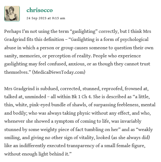 SAVE THE DATE: We’re looking at Saturday, 14 October for our Zoom discussion of Hard Times at 11am Pacific (US)/2pm Eastern (US)/7pm GMT (London). Very informal chat–tell us what you loved (and didn’t!) about Hard Times. Prior to the meeting, we’ll have a poll on here in anticipation of the Little Dorrit meeting–as it is such an important work, but its end falls near the holidays.