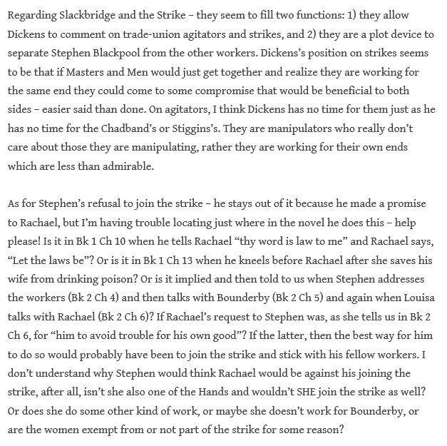 As to Bounderby/Slackbridge, I’m wondering if it’s not so much a “teaming up,” as more of a scapegoating, each on their own side? Stephen is the one person who has the conviction(?) not to join the unionists, but still defends them to the management. I’m personally not sure what to make of his position, except that he kind of represents the “muddle” of it all, though I have trouble seeing a solution in his approach, except to advocate for a better understanding of each to the other (management, hands). I think he’s the scapegoat of the union side because he won’t join; he’s a scapegoat for Bounderby because SB still speaks up for his fellow Hands, but is less threatening, because he won’t join them. It’s a bit of a d—d if you do, d—d if you don’t scenario, and perhaps Stephen represents the kind of everyman who suffers for the injustices of both sides.