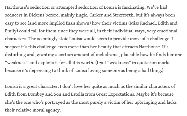 The Stationmaster compares Louisa with other similar Dickensian characters (Edith Dombey, Estella), and what makes her different–and, perhaps, tantalizingly challenging to Harthouse: