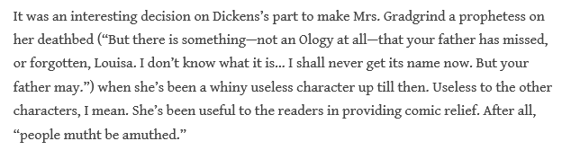 Don’t read this paragraph if you haven’t finished the book yet. Does anyone else get the impression that Bounderby had started to believe his own propaganda about his mother and childhood? He doesn’t just talk about it at strategic moments when he’s trying to keep the Hands in line or when he wants to impress someone. He seems to enjoy bringing it up as often as possible. It’d be hard for him to forget the truth though while sending his mother thirty pounds each year.