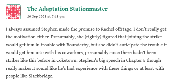 Maybe I shouldn’t have used the phrase “joining forces.” Obviously, the two aren’t deliberately and knowingly teaming up. But the fact that both of them publicly bash Stephen Blackpool and give him no benefit of the doubt shows that there’s not a big difference between them morally.