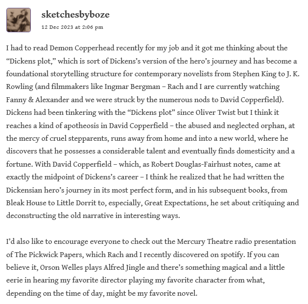 Boze discusses his recent read of Demon Copperhead–a modern retelling of David Copperfield in the deep south by Barbara Kingsolver which we both enjoyed–and how Dickens’s plots keep popping up again in different forms, as though they are the secret of a successful novel: