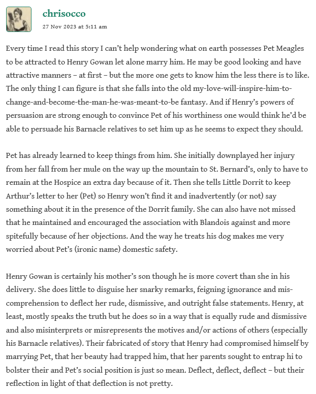 “What on earth possesses Pet Meagles to be attracted to Henry Gowan”? Chris considers this: