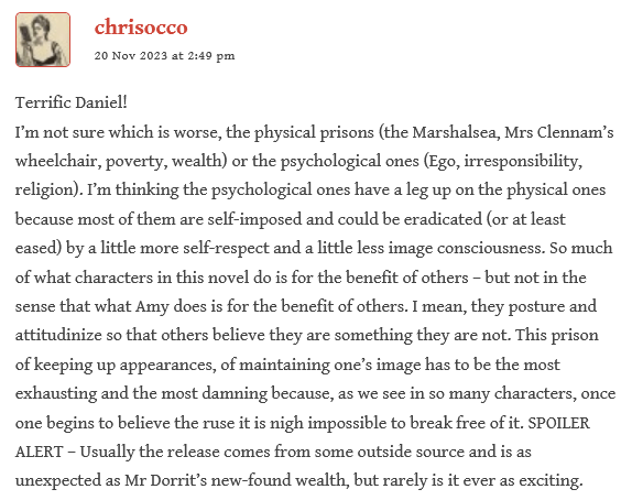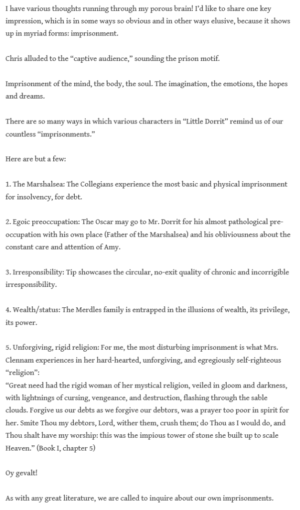 Daniel writes beautifully of the many forms of “imprisonment” in the novel: imprisoned by the Marshalsea, by selfishness, by false religion, etc: