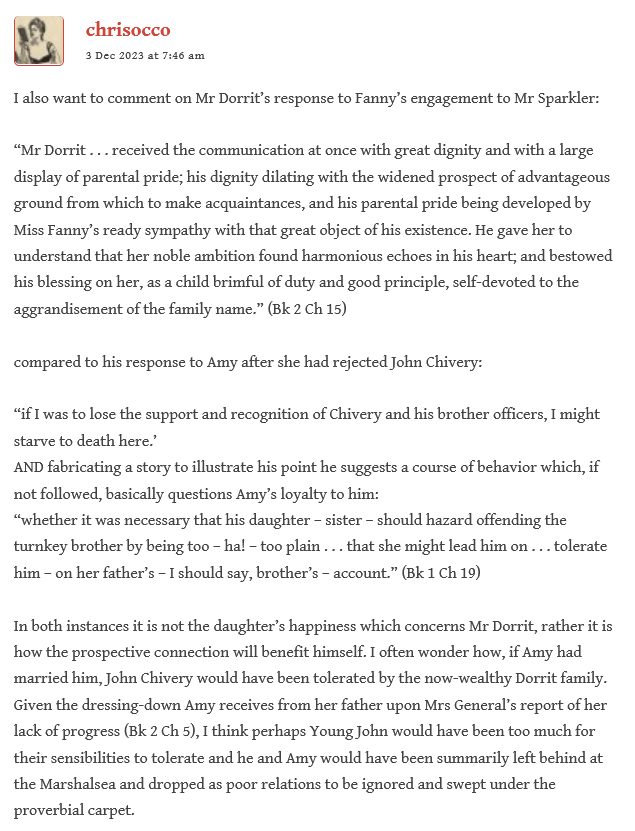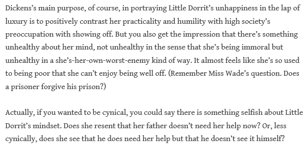 The Stationmaster brought up some intriguing thoughts and questions regarding Amy Dorrit’s attitude about her sudden change of circumstances in Book II: