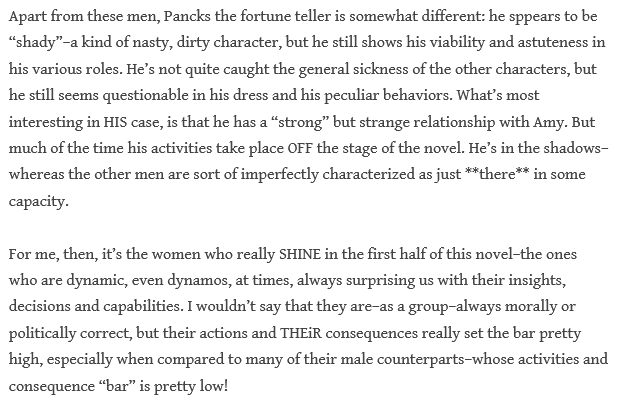“…not only does your list get at the personalities who ‘highlight’ these kinds of ‘entrapments’ but it really allows the novel’s readers a set of terms which we can feed BACK into our readings of the first 4 segments of the novel (for more understanding), but also a terminology that we can apply GOING FORWARD into the next two segments of the novel–and probably beyond that to the novel’s finish!”