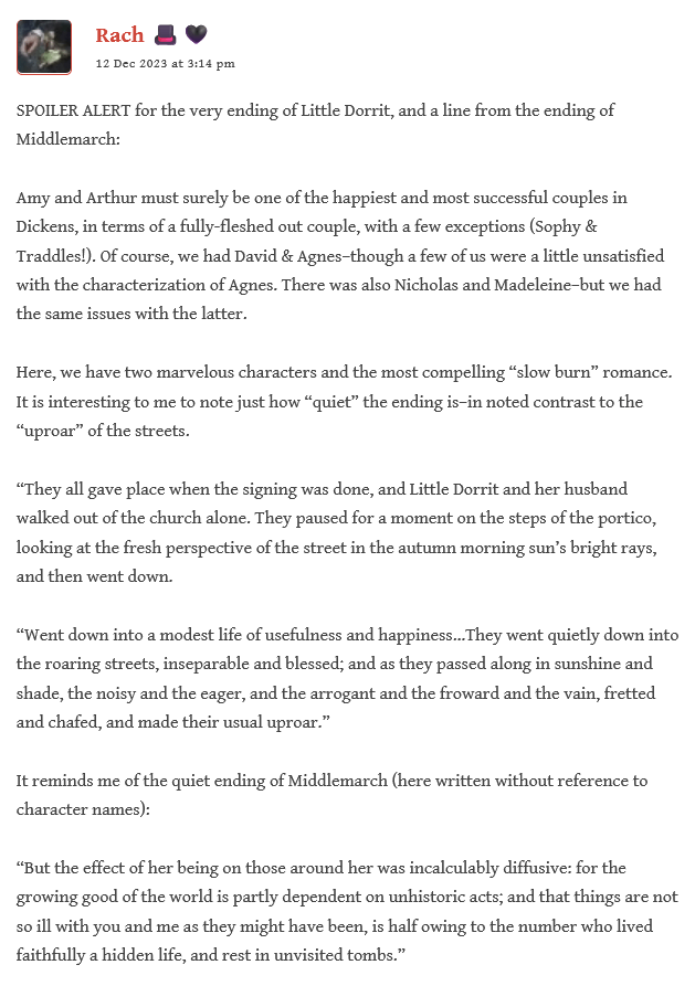 I was pondering the very “quiet” ending of Little Dorrit, contrasting Arthur and Amy’s quiet life with the “uproar” of the streets, and thinking of George Eliot’s later conclusion of Middlemarch: