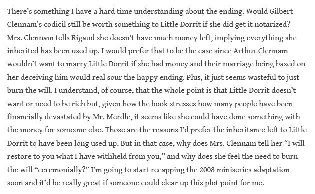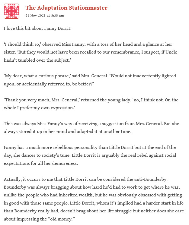 Upcoming: Friendly reminder that, for those interested, the Adaptation Stationmaster will be leading us through an episode recap of the 2008 Little Dorrit miniseries this week! For those who are going to be watching (self-paced), feel free to comment under his posts to discuss your thoughts.