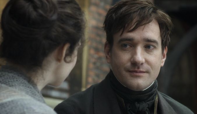 As Little Dorrit reenters the Marshalsea she hands Mr. Chivery Sr. his son’s hat. She can’t bear to look him in the face as she does so, and she doesn’t even try to look at John himself. “They always was a proud lot, the Dorrits was,” grumbles the elder Chivery. To his credit, John says, “I won’t hear a word said against her.” Once his father leaves, giving him some privacy, he composes a new, more depressing inscription for his tombstone. “Here lie the mortal remains of John Chivery, never anything worth mentioning, who died of a broken heart, requesting with his last breath that the word, Amy, be inscribed over his ashes which was accordingly done by his afflicted father.” Lots of credit to Russell Tovey for looking so goofy as this character while also being heartbreakingly earnest.