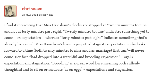 It is possible that even the way Dickens writes about the clock reflects Miss Havisham’s–and perhaps, eventually, Pip’s–“perpetual stagnate expectation”?