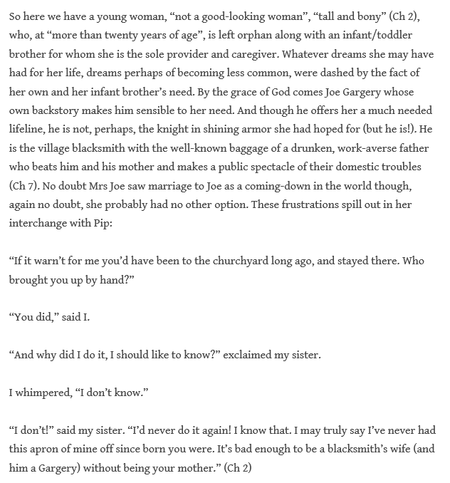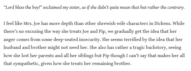 And do we have some “doubling” in Mrs Joe and Miss Havisham? Here, Chris champions Mrs Joe, one who hasn’t been given many opportunities in life, and who “has no identity of her own”:
