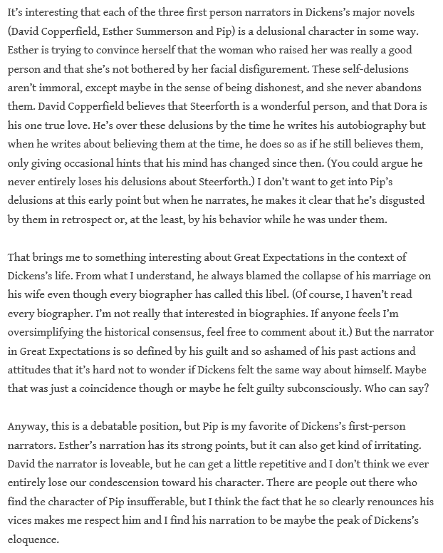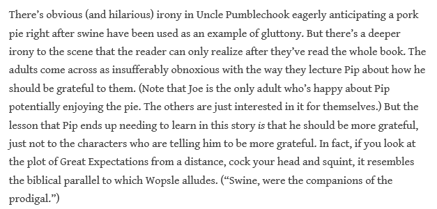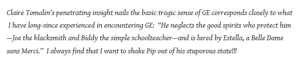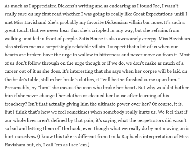 I love this insight from Pip. “So, throughout life, our worst weaknesses and meannesses are usually committed for the sake of the people whom we most despise.” That’s true of me. I tend to lose my temper and lash out the most at people whom I objectively think I should really just ignore, making a fool of myself in the process.