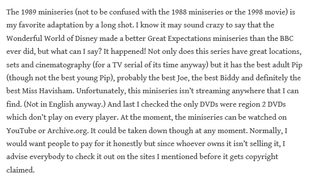 Boze and I are eager to watch the 1989 miniseries of Great Expectations recommended here by the Stationmaster! I will put a link below to where it can be currently found on YouTube: