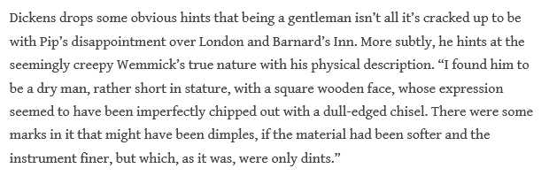 Later, he comments on how even the physical descriptions of the settings and characters surrounding Pip might reflect a disappointment with the expectations of what it is like to be a “gentleman”: