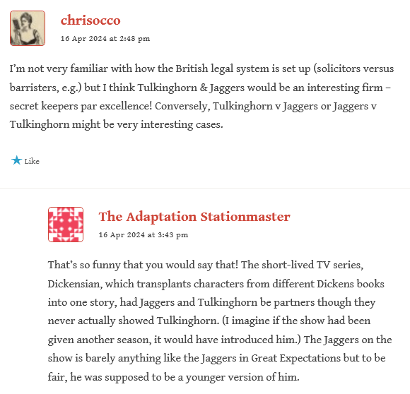 Chris loves the idea of a Tulkinghorn & Jaggers firm in London–and the Stationmaster shares that other Dickensians have clearly wanted to see the same thing: