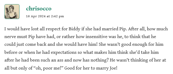 Chris would lose respect for our dear Biddy, however, had she accepted Pip: