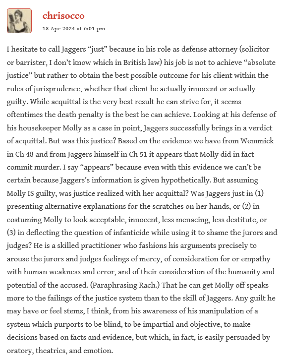 I try and grapple with the enigmatic and amoral Jaggers, trying to figure out where he fits into the moral universe of Dickens, and what he says of Pip and of the Law: