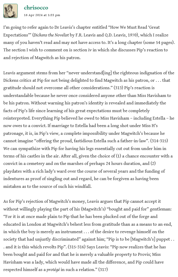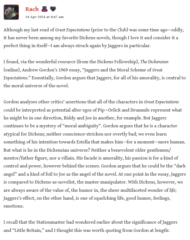 SAVE THE DATE: We will have our Zoom chat on Great Expectations on Saturday, 4 May, 2024! 11am Pacific (US)/2pm Eastern (US)/7pm GMT (London). It is an informal chat with no set agenda; feel free to bring a favorite passage or topic to discuss! The Zoom link will be sent out prior to the chat; please feel free to message Rach here on the site or on twitter if you’d like the link.
