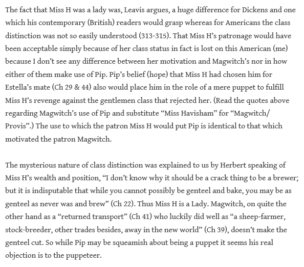 As a reader, how to we react to Pip’s reaction to Magwitch’s revelation? Why would it be so different, had it been Miss Havisham, as Pip had imagined? Is it the class difference/prejudice? Moral qualms? Personal repugnance? Being a “puppet” of another? Some combination?