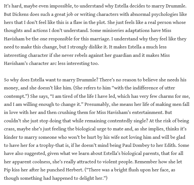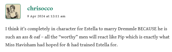 The Stationmaster grapples with Estella’s choice of Drummle. Is it even “in character,” even for an “abnormal” psychology such as has been fostered in her?