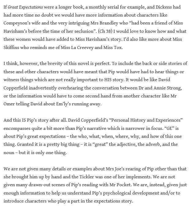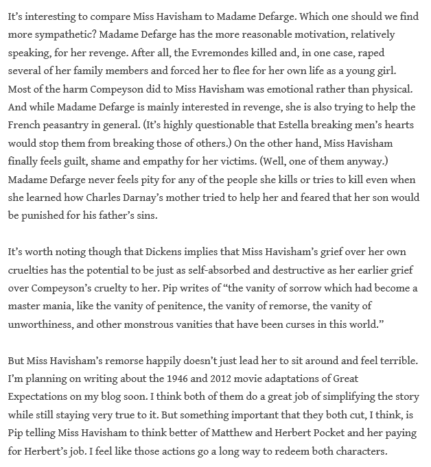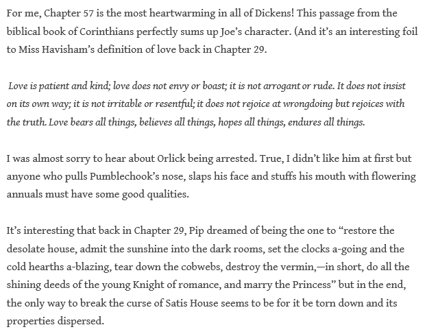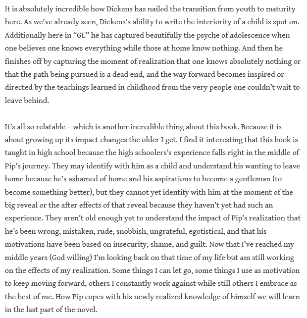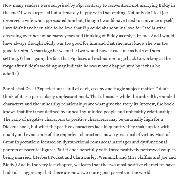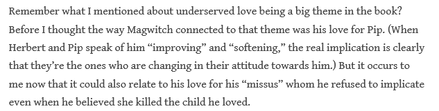 Though Chris would like to have more information on some of our side characters, it is also clear that “the brevity of this novel is perfect.” She comments on how Dickens portrays with such accuracy the growth of Pip, and how Great Expectations, bildungsroman that it is and as much as it is read in high school, almost takes a more mature worldview, emerging from the experience of years, in order to appreciate it fully: