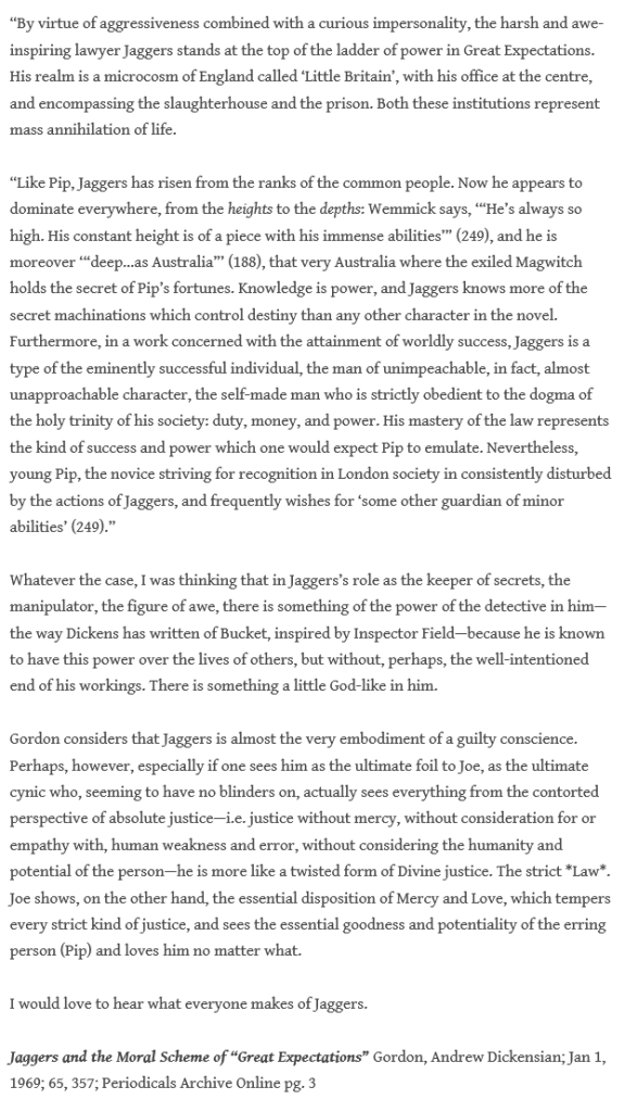 5. Dickens and the Law; Jaggers and Dickens’s Moral Universe (Jaggers as a kind of amoral part of the moral universe of Dickens, and the inhuman, ruthless face of the law and its intimidation–yet also its tendency to not commit itself, and to wash its hands of those it affects.)